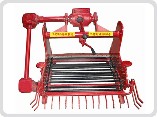 此薯類土豆收獲機是與手扶拖拉機相配套,一側力輸出(8-11馬力)拖拉機為動力,采用齒輪傳動,薯塊由輸送鏈輸送到機器尾部的震動側篩上,經過篩動后滑落到機器前進方向的后側地面上以便收集。